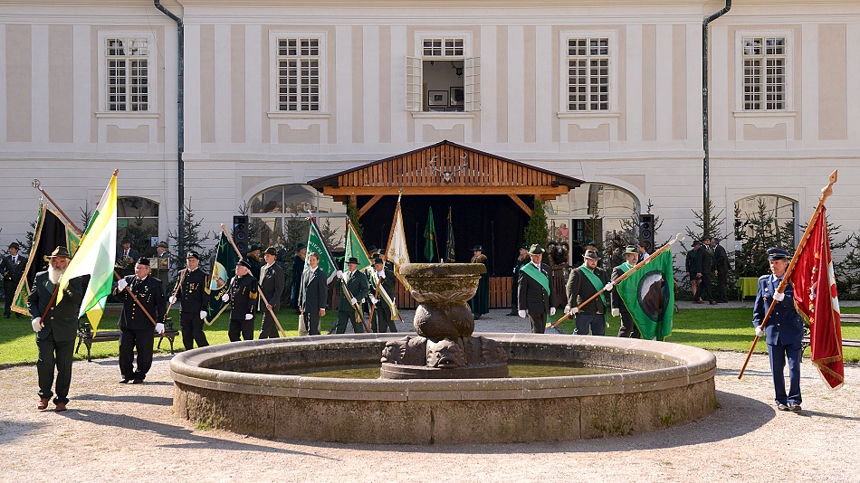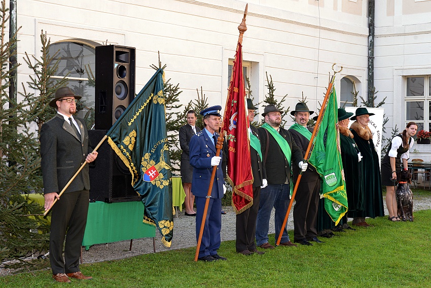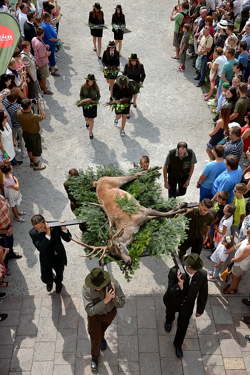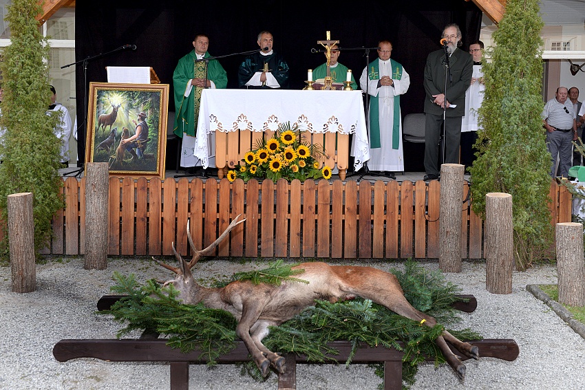 Nedeľný program slávností vyvrcholil svätohubertovskou omšou so sprievodom s uloveným jeleňom a obetnými darmi, ktorá je veľkou velebou prírody.
