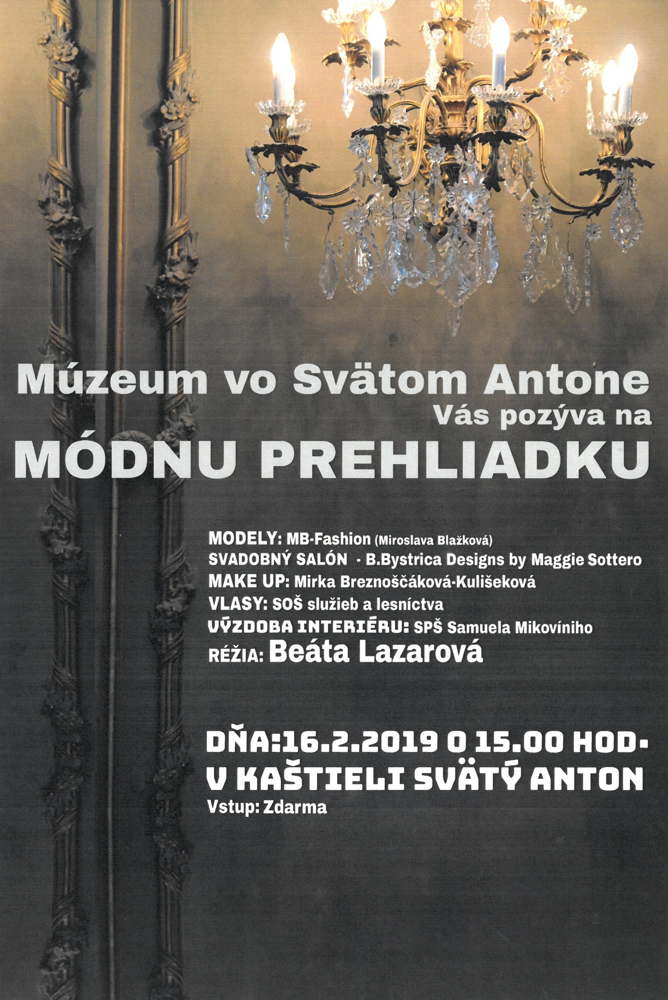 V sobotu 16.02.2019 sa výstavné priestory Múzea vo Svätom Antone premenili na prehliadkové mólo, kde sa konal už IV. ročník módnej prehliadky. Tentokrát tu boli predstavené vychádzkové a spoločenské šaty siete butikov MB Fashion Mirky Blažkovej, ktoré majú v ponuke voľnočasové odevy, nohavice, sukne, klobúky, šatky, šály a saká pre dámy aj pánov, ako aj strihovo nadčasové originálne spoločenské šaty a exkluzívne pánske obleky na všetky spoločenské príležitosti. Luxusnými svadobnými šatami sa predstavil banskobystrický svadobný salón Designs, ktorý pripravil kolekciu prestížnych svadobných šiat austrálskej značky MAGGIE SOTTERO. Detskými odevmi sa na módnej prehliadke prezentoval obchod Bocianik z Banskej Bystrice. Detské, svadobné a vychádzkové modely boli zaujímavo doplnené partami, venčekmi a čelenkami z ateliéru Ľubice Drengubiakovej, ktorá tvorí pod značkou Drôtiková, topánky a kabelky zapožičala Eva Rochová z Banskej Štiavnice a bižutéria bola z banskoštiavnickej predajne LU-LU. Módna prehliadka prebiehala v réžii profesionálnej módnej návrhárky Beatky Lazarovej, ktorá choreografiou mladých modeliek a modelov, vynikajúcim výberom francúzskych šansónov a skladieb dokázala vyčariť neopakovateľnú a jedinečnú atmosféru. Študentky z odboru Kaderník zo Strednej odbornej školy služieb a lesníctva v Banskej Štiavnici, pod odborným vedením majsterky odborného výcviku Mgr. Ivetky Fendekovej, mali príležitosť vykúzliť na hlavách modeliek rôzne druhy vychádzkových, spoločenských a svadobných účesov z krátkych aj dlhých vlasov. O dokonalý vzhľad modeliek sa postarala profesionálna vizážistka spoločnosti Mary Kay Mgr. Mirka Kulišeková-Breznoščáková, s bohatými skúsenosťami s líčením na bežné večierky, ako aj na rôzne spoločenské udalosti, ako plesy, promócie, stužkové a svadby. Ozvučenie bolo zapožičané zo Školského internátu Strednej odbornej školy služieb a lesníctva Banská Štiavnica, prehliadková miestnosť vyzdobená prácami študentov zo Strednej priemyselnej školy Samuela Mikovíniho – odbor Odevný dizajn (Mgr.art. Larisa Gombárová). Plagát na módnu prehliadku navrhol Mgr.art Ivan Slovenčák z odboru Grafický dizajn zo Strednej priemyselnej školy Samuela Mikovíniho. Do konca februára je v Audienčnom salóne svadobné nastieranie v červeno-sivom tóne, ktoré pripravila Stredná odborná škola služieb a lesníctva – Odbor Hostinský/Hostinská a modely šiat z dielne odboru Odevný dizajn zo Strednej priemyselnej školy Samuela Mikovíniho. Celú módnu prehliadku fotografoval Ľubomír Lužina. IV. ročník módnej prehliadky pritiahol do svätoantonského kaštieľa viac ako 150 návštevníkov zo Svätého Antona a širokého okolia Banskej Štiavnice. Ďakujeme všetkým účinkujúcim, ktorí sa podieľali na tomto krásnom podujatí, ako aj návštevníkom, ktorí našu snahu dokázali oceniť.