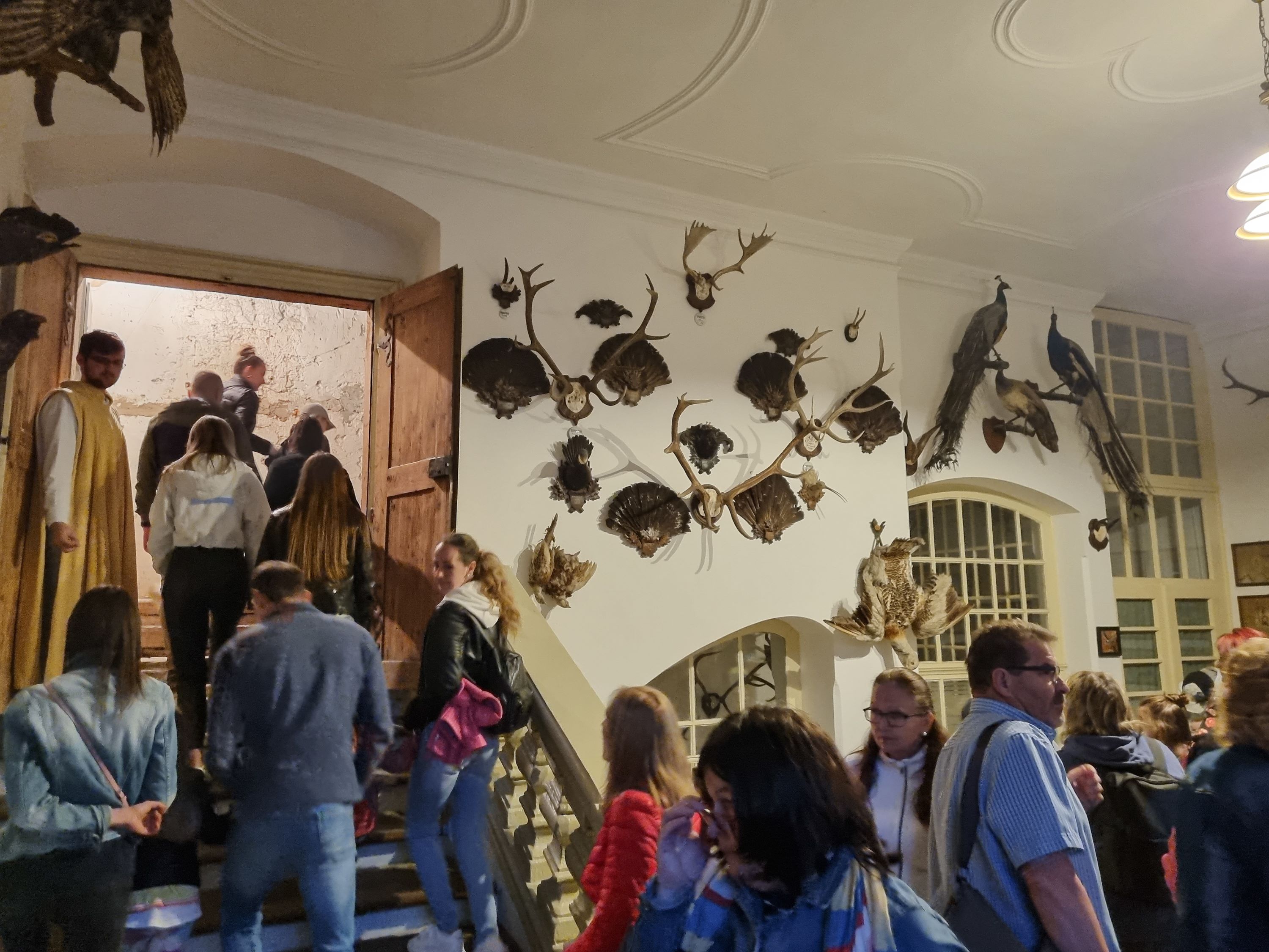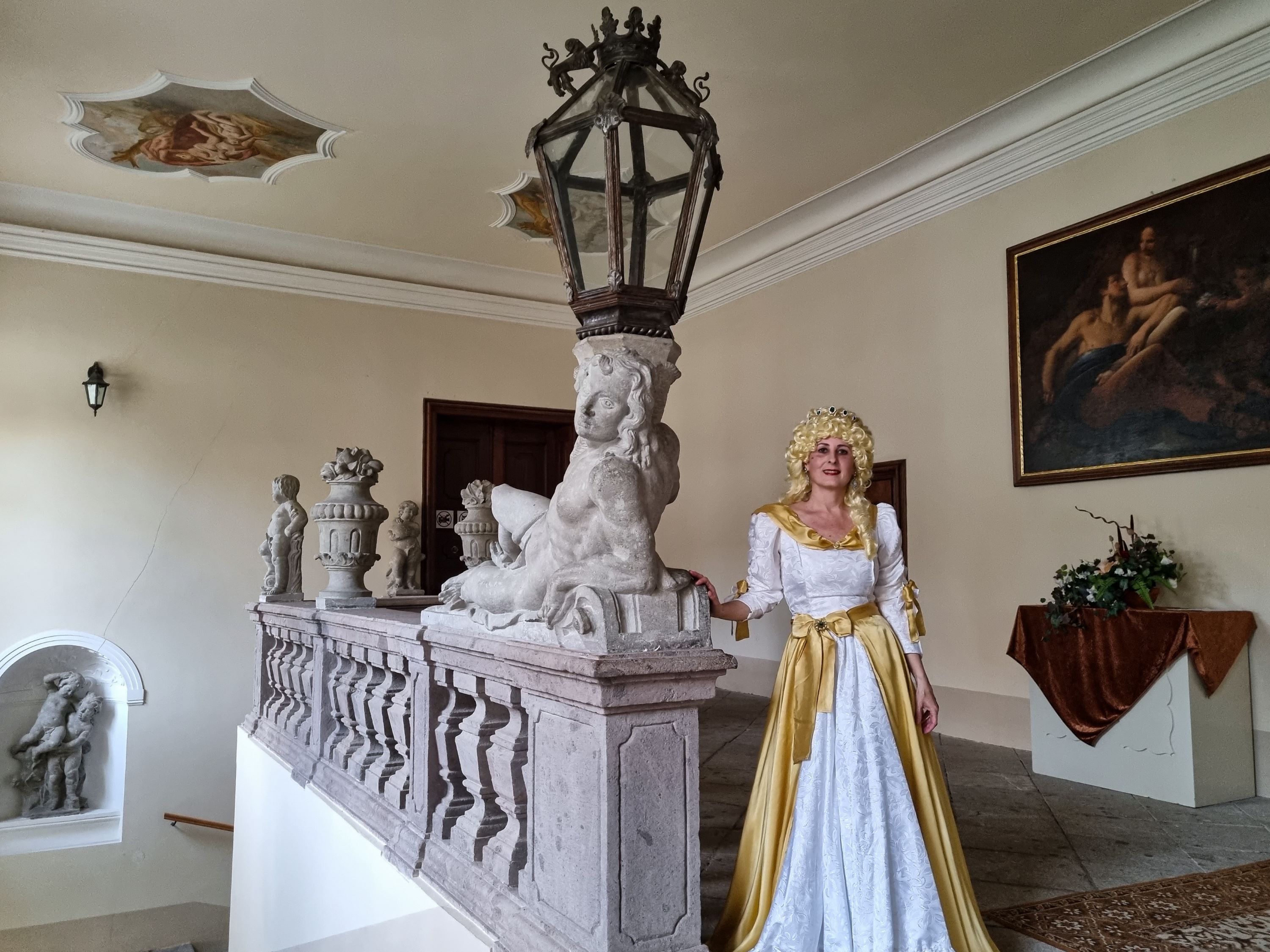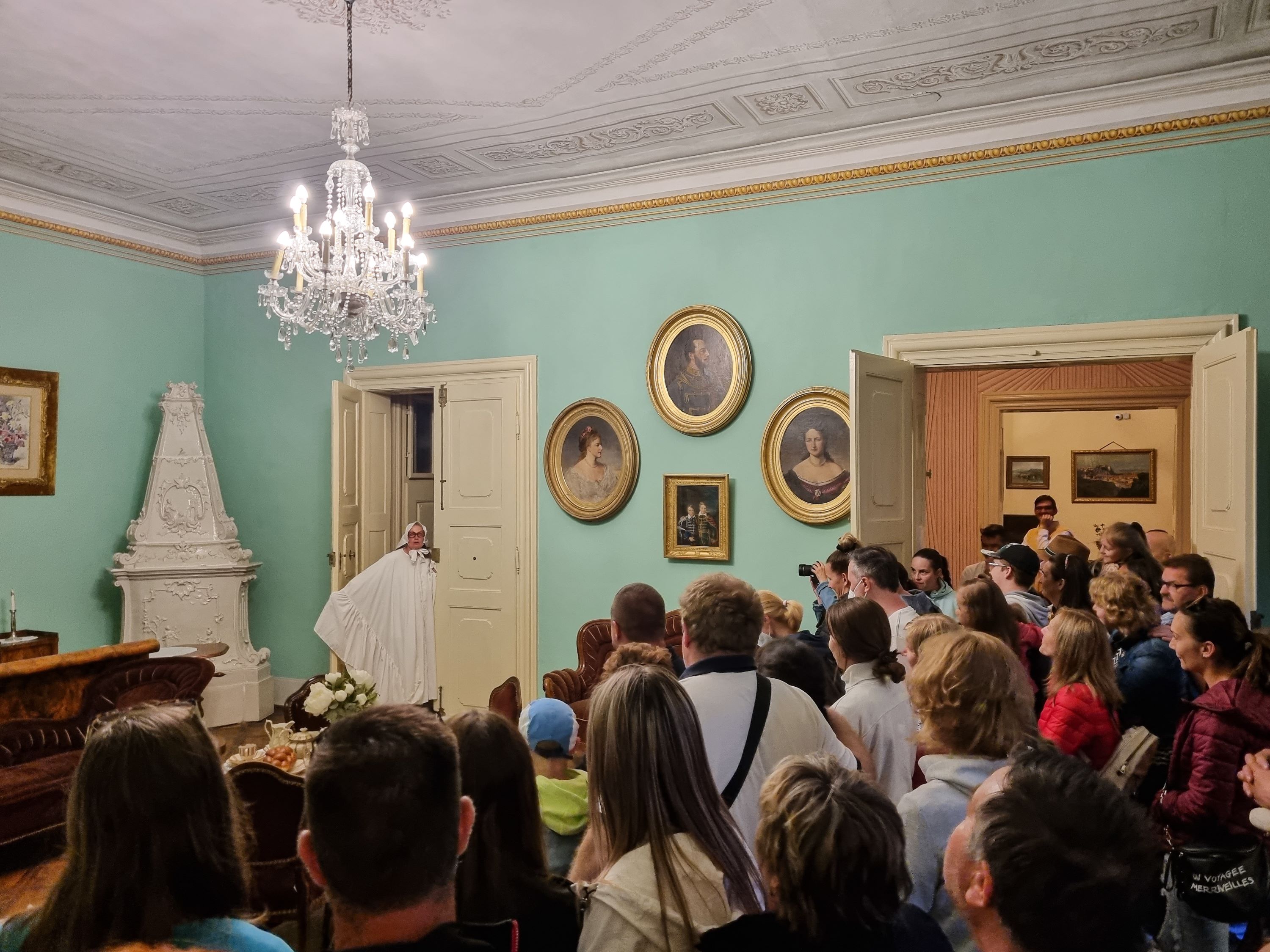 Vo večerných hodinách sa otvorili salóny historickej expozície osvetlené krásnymi krištáľovými lustrami a návštevníci sa v sprievode lektoriek oblečených v dobových kostýmoch mohli poprechádzať „zakázanými“ časťami salónov, ktoré sú počas bežnej prehliadky kaštieľa za šnúrou. Pre súťaživých sme pripravili krátky minikvíz a v Zlatom salóne im Mgr. Andrea Gregová pútavo porozprávala ako sa zláti nábytok a aké rôzne netradičné predmety sa pri tom používajú. Návštevníci si vyskúšali, ako do salónov vchádzali urodzení páni i vznešené dámy, ale aj ako z nich vychádzalo služobníctvo. Jedno staré strašidlo sa nám posťažovalo, že sa s panstvom ťažko žilo a prečo už v kaštieli nestraší. Prvýkrát mohli návštevníci nazrieť „pod strechu“ do podkrovia a na nádvorí si vychutnať kávu alebo horúcu čokoládu v novej kaviarničke. Nočnú romantickú atmosféru dodávalo podujatiu rozsvietené nádvorie a krásny plný mesiac.