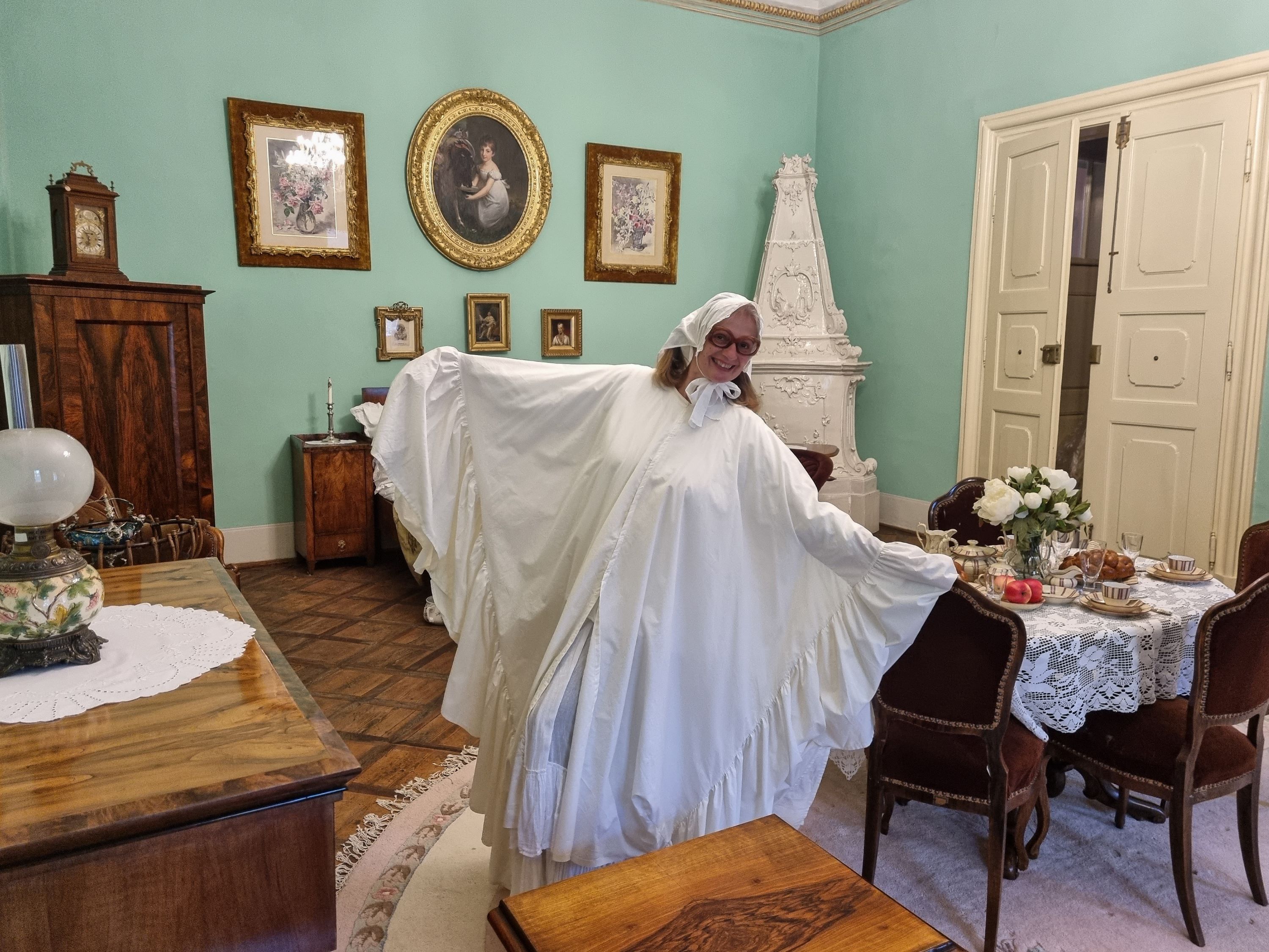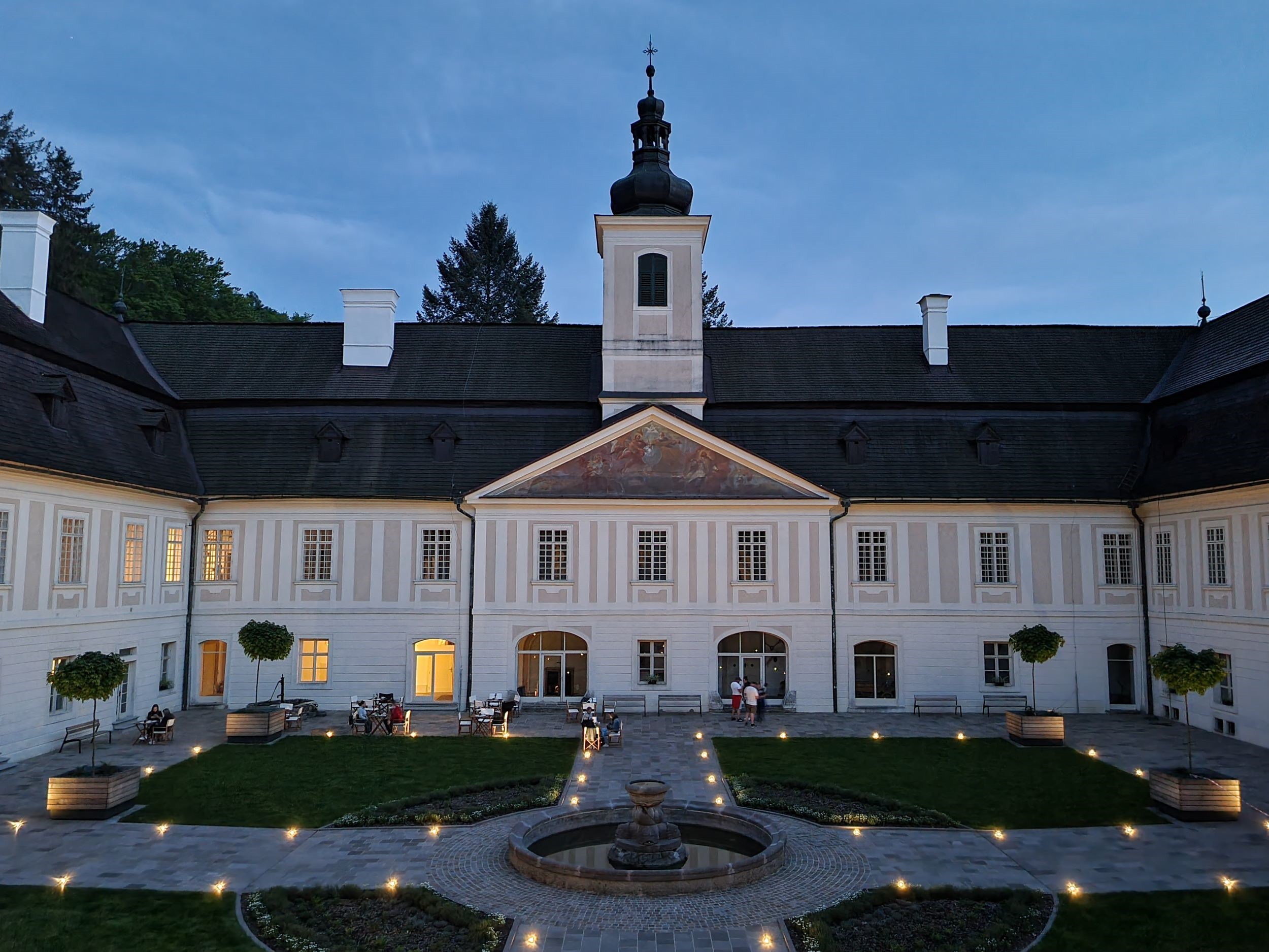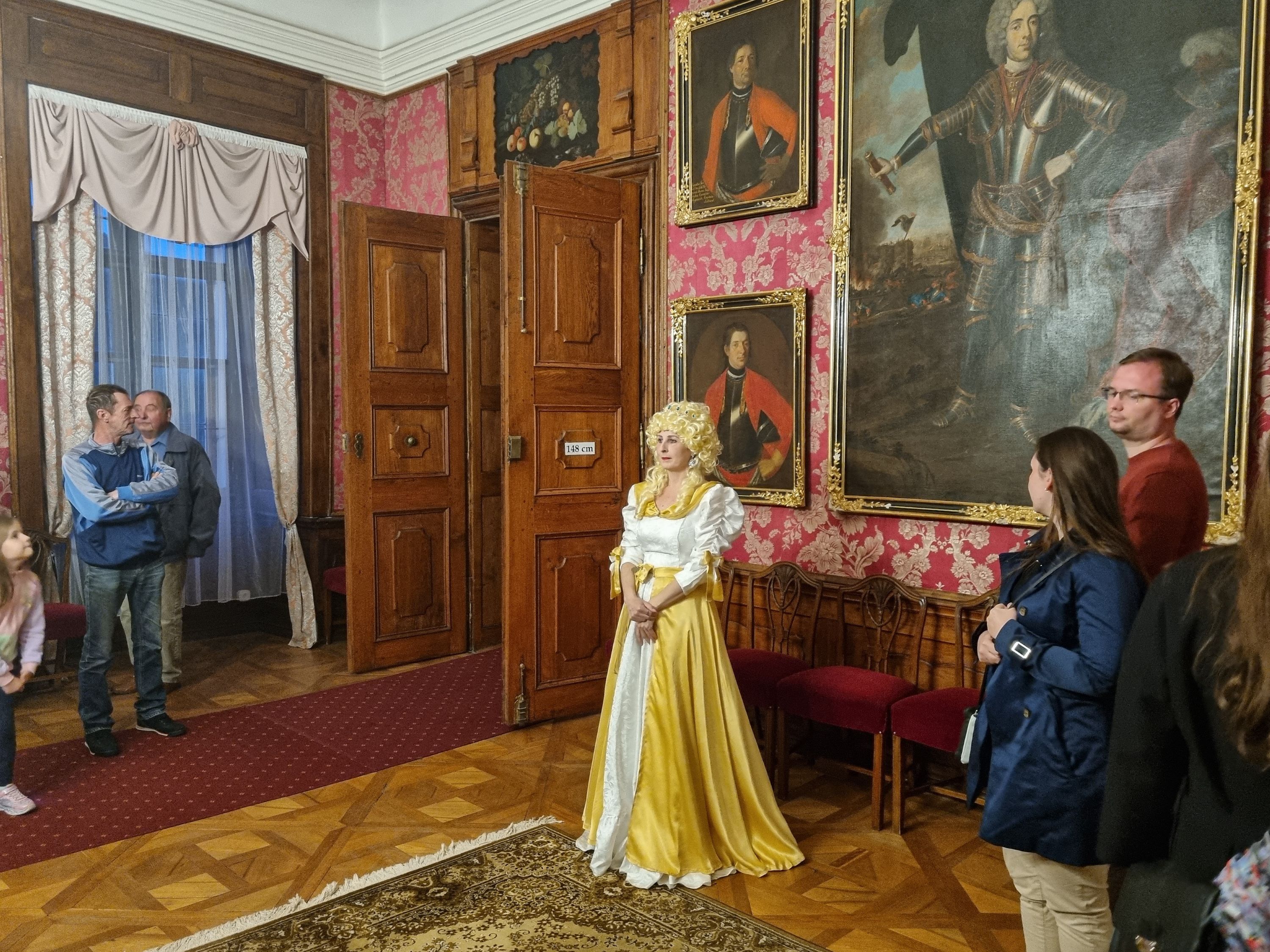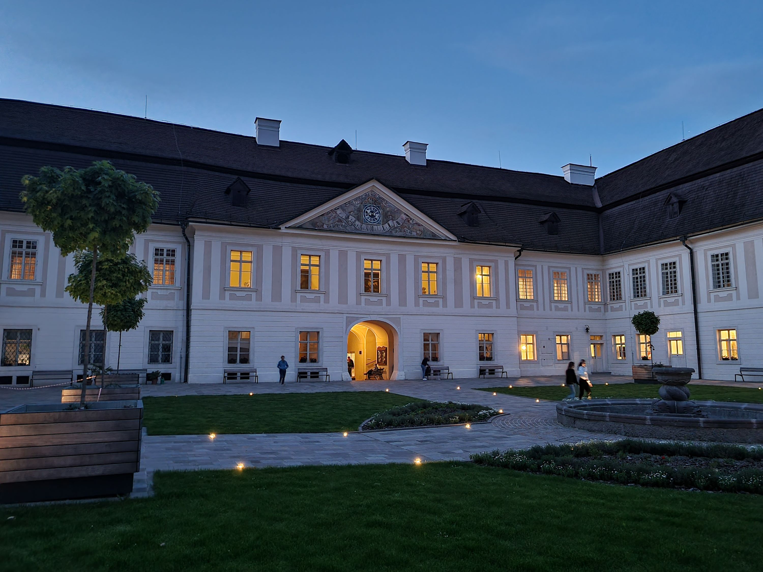 Vo večerných hodinách sa otvorili salóny historickej expozície osvetlené krásnymi krištáľovými lustrami a návštevníci sa v sprievode lektoriek oblečených v dobových kostýmoch mohli poprechádzať „zakázanými“ časťami salónov, ktoré sú počas bežnej prehliadky kaštieľa za šnúrou. Pre súťaživých sme pripravili krátky minikvíz a v Zlatom salóne im Mgr. Andrea Gregová pútavo porozprávala ako sa zláti nábytok a aké rôzne netradičné predmety sa pri tom používajú. Návštevníci si vyskúšali, ako do salónov vchádzali urodzení páni i vznešené dámy, ale aj ako z nich vychádzalo služobníctvo. Jedno staré strašidlo sa nám posťažovalo, že sa s panstvom ťažko žilo a prečo už v kaštieli nestraší. Prvýkrát mohli návštevníci nazrieť „pod strechu“ do podkrovia a na nádvorí si vychutnať kávu alebo horúcu čokoládu v novej kaviarničke. Nočnú romantickú atmosféru dodávalo podujatiu rozsvietené nádvorie a krásny plný mesiac.